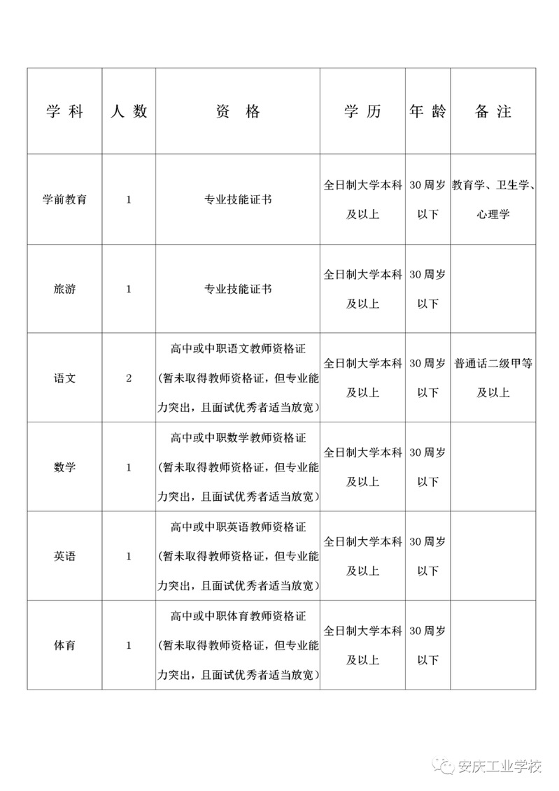 安慶工業(yè)學(xué)校是安慶市教育體育局直屬的唯一一所公辦全日制中職學(xué)校。因教學(xué)需要,面向社會招聘臨時代課教師若干名,現(xiàn)將有關(guān)情況公告如下: