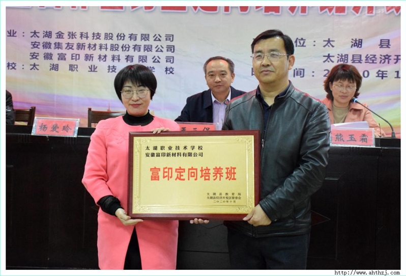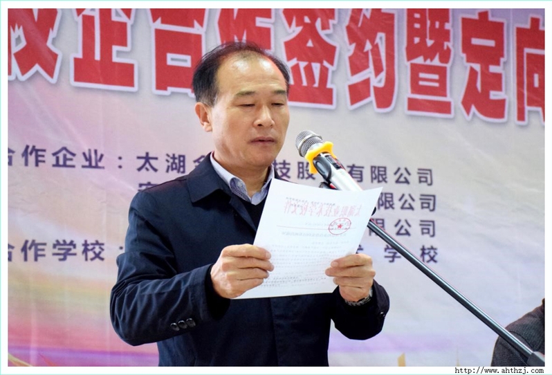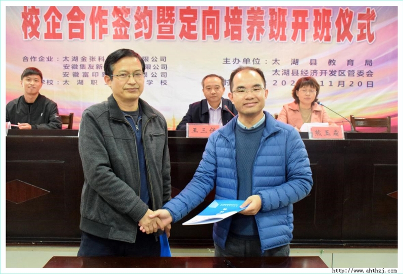 11月20日下午3點(diǎn),校企合作簽約暨定向培養(yǎng)班開班儀式在太湖職校教學(xué)樓7樓會議室舉行,太湖縣教育局黨委書記、局長王三保出席儀式,開發(fā)區(qū)集友、金張和富印等三家企業(yè)的人力資源部門負(fù)責(zé)人,太湖職校部分班子成員、相關(guān)處室負(fù)責(zé)同志、定向培養(yǎng)班班主任及學(xué)生參加儀式,儀式由縣教育局副局長熊玉霜主持。
