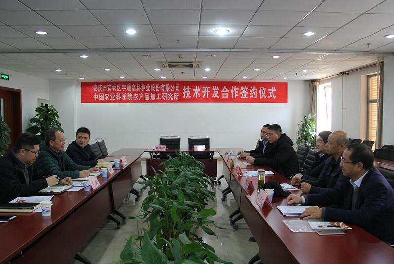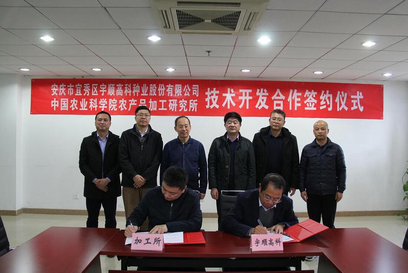 11月27日下午,中國農業(yè)科學院農產品加工所與宇順高科種業(yè)股份有限公司簽約儀式在北京舉行。中國農業(yè)科學院農產品加工研究所黨委書記王長江、安慶市宜秀區(qū)區(qū)委書記婁雪松、成果轉化處副處長常盛、新資源食品研究中心研究員佟立濤、區(qū)農業(yè)農村局局長潘緒中、區(qū)文化和旅游局局長何反修、區(qū)林業(yè)局副局長李凱以及公司創(chuàng)始人王發(fā)文等出席。