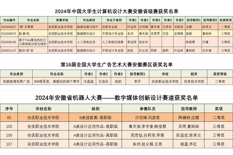 在安徽省教育廳公布的《關(guān)于公布2024年7月至8月安徽省大學(xué)生學(xué)科和技能競賽部分賽事獲獎名單的通知》中,安慶職院沈璐、陳秀云老師指導的葉運來(lái)、汪仰烽、魯天保、王夢(mèng)帥、劉彥君學(xué)生團隊獲得2024年中國大學(xué)生計算機設計大賽安徽省級賽“數媒動(dòng)漫與短片類(lèi)-動(dòng)畫(huà)專(zhuān)業(yè)組”一等獎;施展、董辯辯老師指導的余洋、魯天保、吳莟雪、王佼、史朝霖學(xué)生團隊獲得“數媒靜態(tài)設計類(lèi)-平面設計專(zhuān)業(yè)組”二等獎;陳曉慧、方驥、董辯辯、劉文倩老師指導的學(xué)生團隊分別獲得“人工智能應用類(lèi)-人工智能實(shí)踐賽”和“數媒靜態(tài)設計類(lèi)-平面設計專(zhuān)業(yè)組”三等獎。在第16屆全國大學(xué)生廣告藝術(shù)大賽安徽賽中,李丹老師指導的汪晶晶、王佳樂(lè )、趙航學(xué)生團隊獲得“視頻類(lèi)微電影廣告”二等獎。